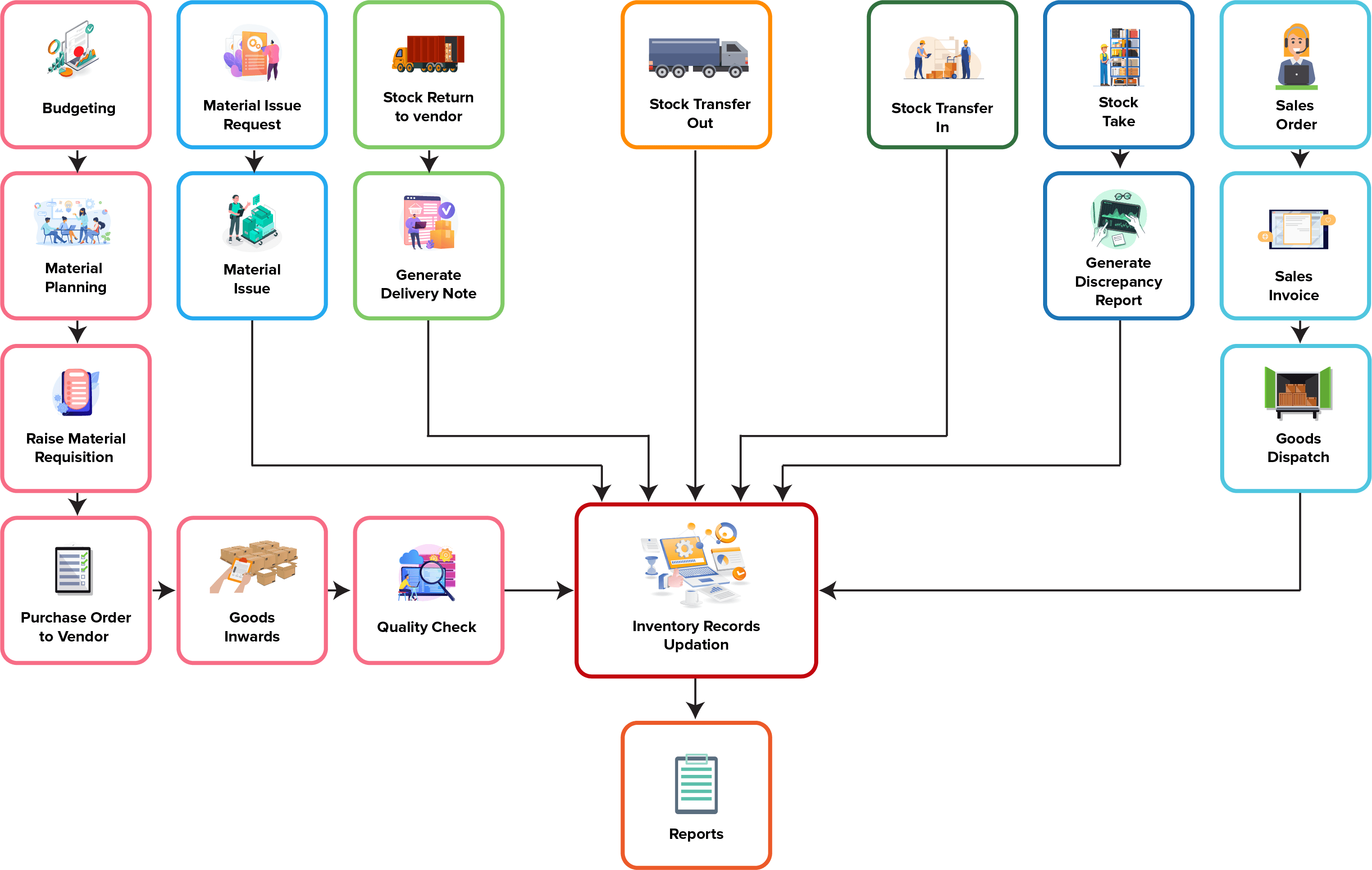 - Synchronize sales/issuance across multiple warehouses and manage drop shipments, inter-warehouse transfers, and back orders with ease